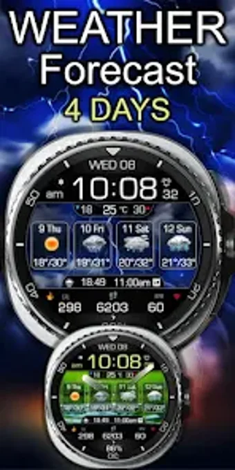 날씨 전체 4일 예보는 Wear OS 장치를 위해 설계된 기능이 풍부한 시계 페이스로, 사용자에게 미적 및 기능적 장점을 제공합니다. 현재 날씨 조건을 매끄럽게 표시하며, 섭씨 또는 화씨의 온도와 최대 4일간의 상세 예보를 포함합니다. 이 시계 페이스는 16개의 낮과 16개의 밤 날씨 이미지를 독특하게 제공하여 시각적 매력을 높이고 필수적인 날씨 정보를 한눈에 제공합니다.